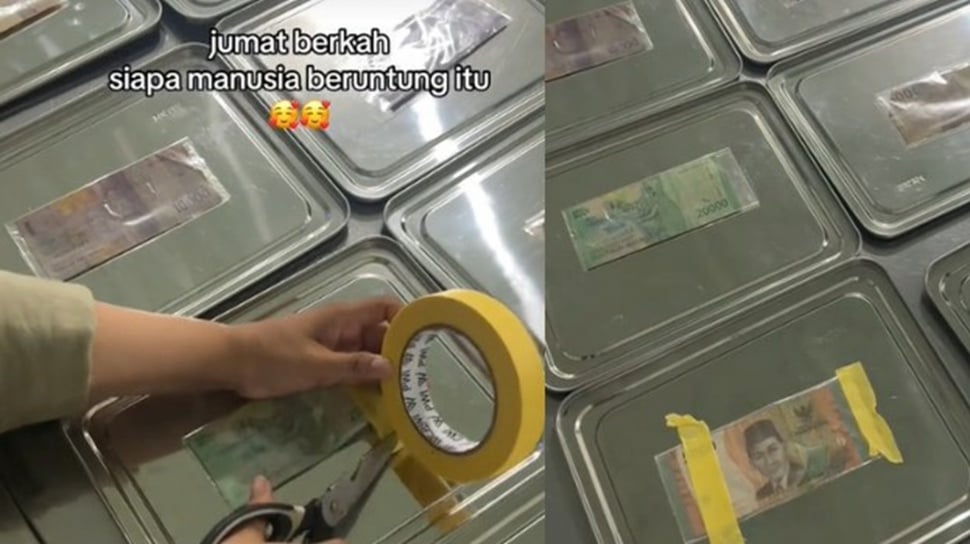 Dalam rekaman tersebut terlihat lembaran uang pecahan Rp5.000 hingga Rp20.000 diselipkan di setiap tray sebelum dibagikan kepada para siswa. Aksi itu direkam dan diunggah melalui akun TikTok resmi lembaga dengan caption “Jumat Berkah. Siapa Manusia Beruntung Itu?”.
