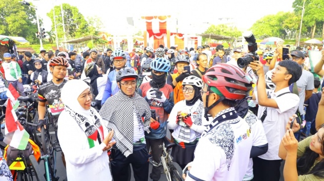 SuaraJatim.id - Gubernur Jawa Timur, Khofifah Indar Parawansa memberangkatkan ratusan pesepeda yang tergabung dalam Gowes Bareng (Gobar) 1.000 Kilometer Ride For Palestine 2 di depan Kantor Gubernur Jawa Timur, Jalan Pahlawan 110 Surabaya, Minggu lalu.
