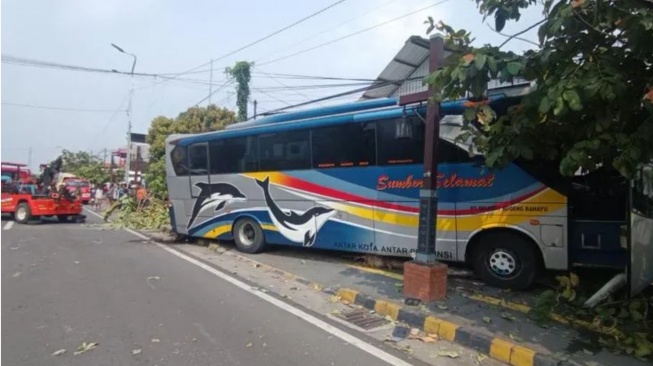 - Benturan keras tersebut mendorong bus hingga menabrak pohon dan menjebol dinding rumah milik warga setempat.