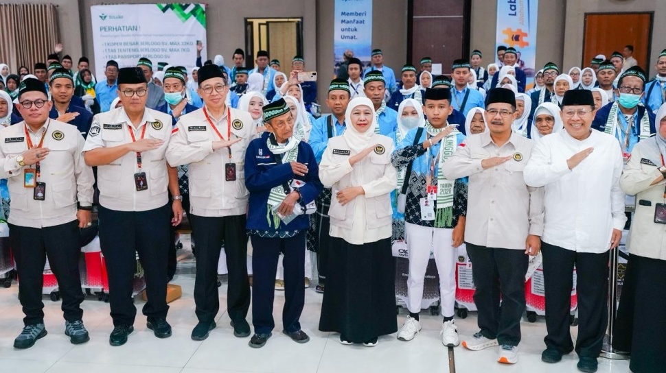 SuaraJatim.id - Gubernur Jawa Timur Khofifah Indar Parawansa melepas keberangkatan jemaah haji kelompok terbang (kloter) pertama Embarkasi Surabaya Tahun 1447 H / 2026 M dari Asrama Haji Surabaya, Rabu (22/4).