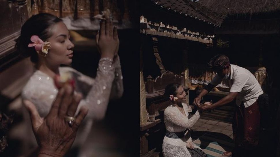 Kemudian, masih dalam foto itu, Ia membagikan momentum sedang bersama seorang kakek-kakek dan nenek-nenek lengkap dengan busana khas Bali sambil membawa sesaji. Ia juga nampak mengunggah foto posisi menyembah, ritual khas Hindu Bali.