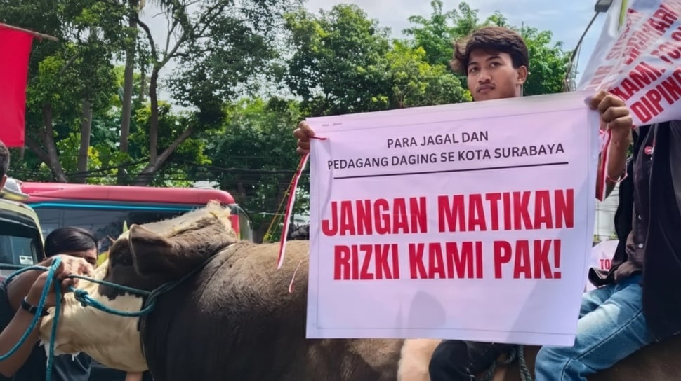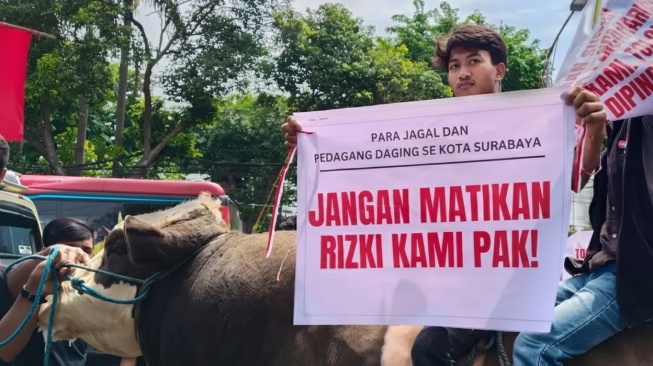 SuaraJatim.id - Ratusan tukang jagal dan pedagang daging menggelar aksi unjuk rasa di depan Gedung DPRD Kota Surabaya, Jawa Timur (Jatim), Senin (12/1/2026).