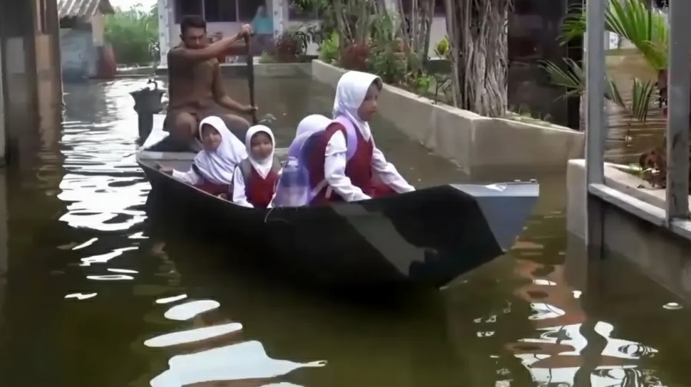 Genangan air menutup akses jalan dan permukiman warga, sehingga siswa kesulitan datang ke sekolah. Menyikapi kondisi tersebut, pihak sekolah berinisiatif menjemput siswa menggunakan perahu.