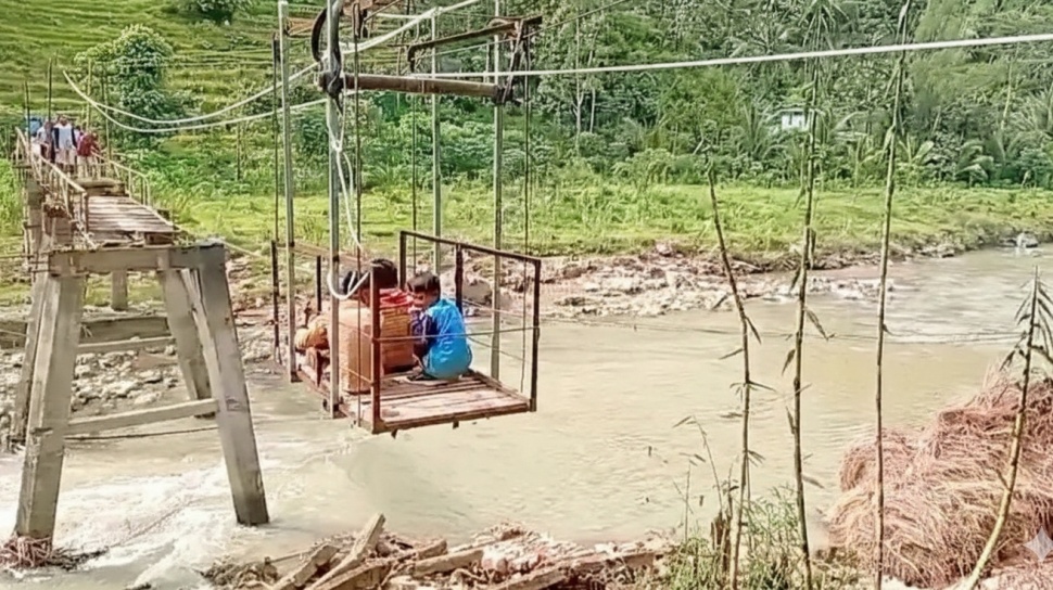 Warga bangun jembatan gantung sementara dari swadaya bersama.